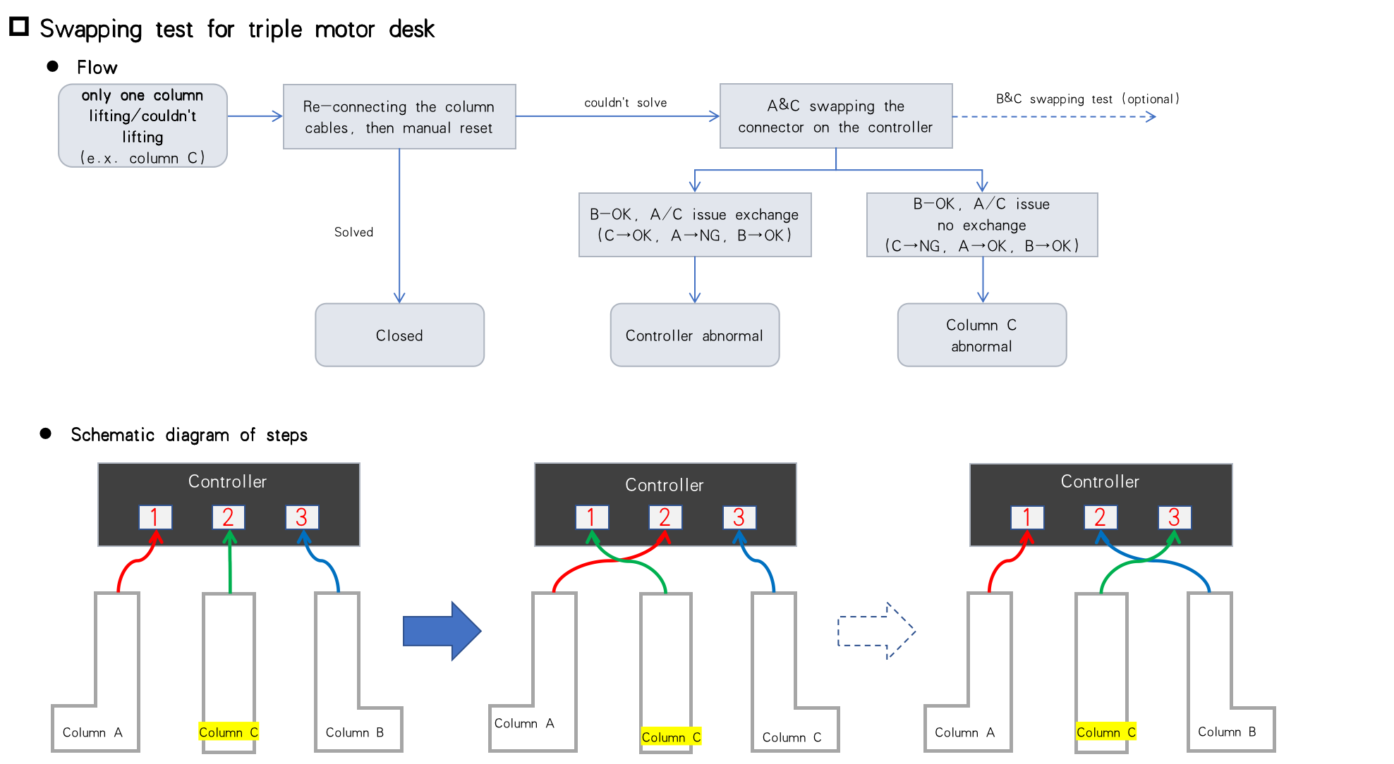 【Gorgias Template】:【升降故障】DWK 交叉 三电机 单边升降 高低升降 -- 升降不同步 单边不升 交叉测试 Cable Swapping Test